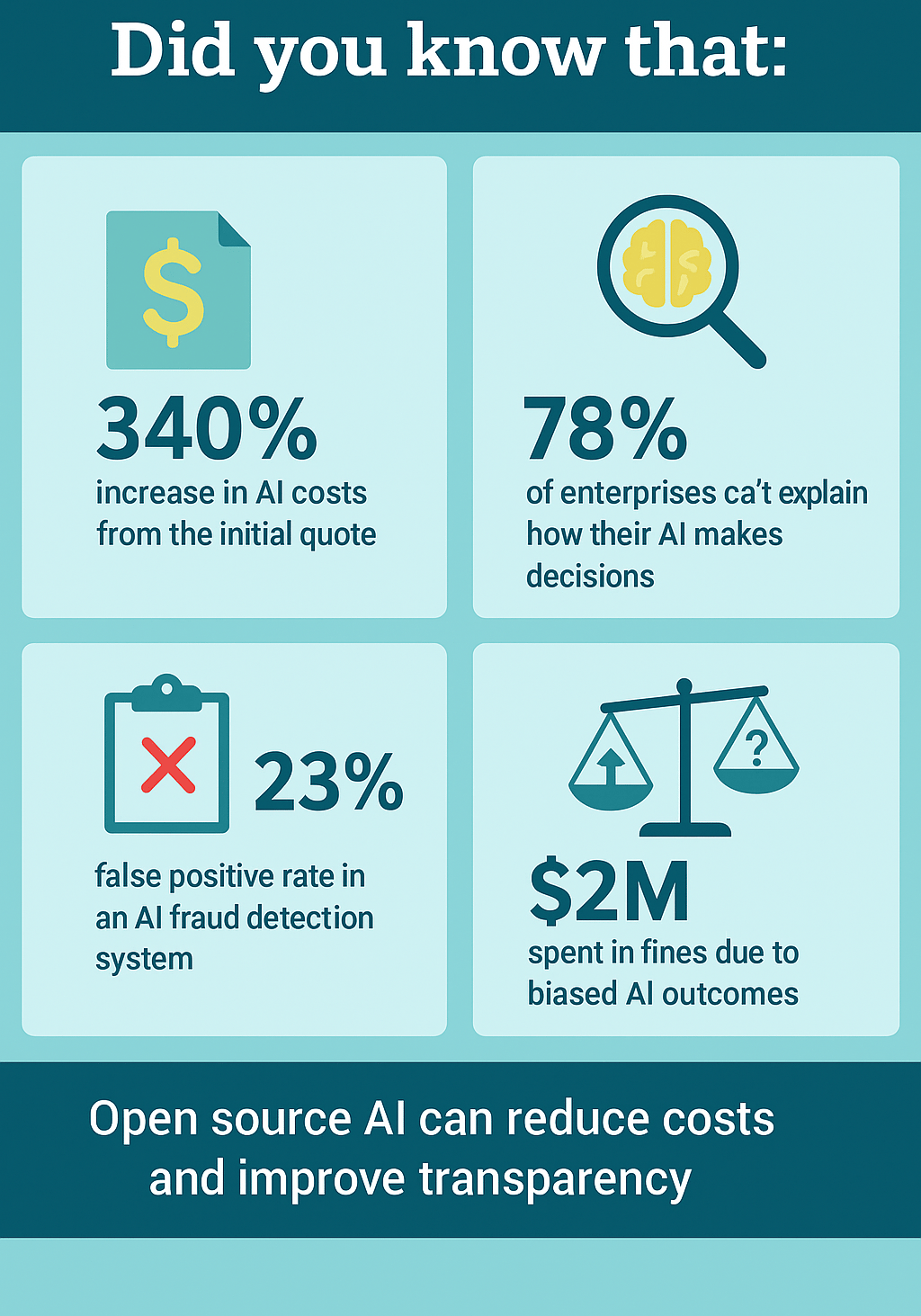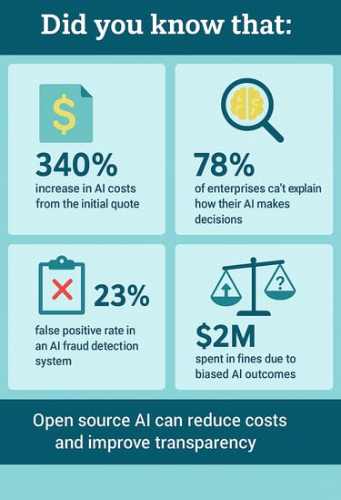 Last quarter, I sat across from a CFO who'd just discovered their company's AI spending had ballooned to $847,000 annually—a 340% increase from the initial quote. Worse, when they asked their vendor to explain why their fraud detection system was flagging legitimate customers at a 23% false positive rate, the response was essentially: "Our proprietary algorithm is too complex to explain."